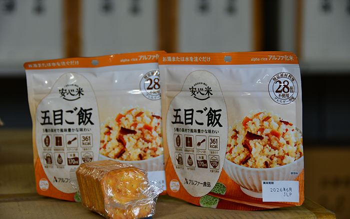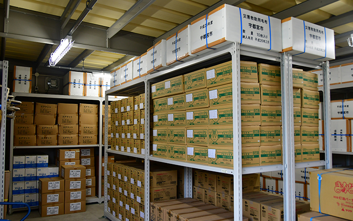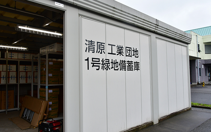 清原工業団地1号緑地備蓄庫などの防災備蓄庫は、市内に全部で14カ所あり、災害救助用の毛布やエアマットの他、5年間保存が可能な災害用クラッカー、水やお湯を入れるだけで食べられ るアルファ化米、災害用トイレや子ども用のおむつなどが保管されています。