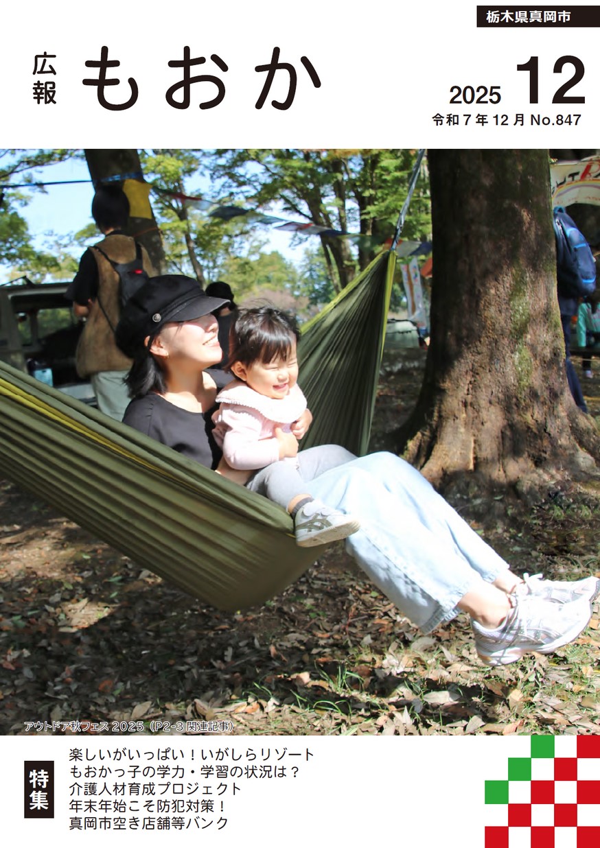 広報もおか12月号 【表紙】アウトドア秋フェス2025 【特集】楽しいがいっぱい!いがしらリゾート、もおかっ子の学力・学習の状況は?、介護人材育成プロジェクト、年末年始こそ防犯対策!、真岡市空き店舗等バンク